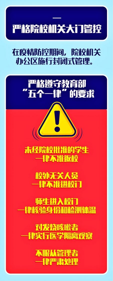 1. 严格遵守教育部“五个一律”的要求:未经院校批准的学生一律不准返校;校外无关人员一律不准进校门;师生进入校门一律核验身份和检测体温;对发烧咳嗽者,一律实行医学隔离观察;不服从管理者一律严肃处理。