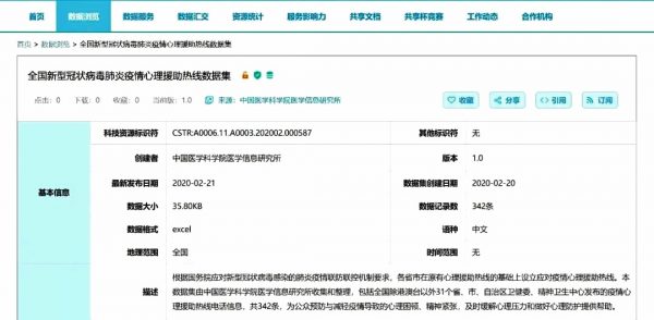 2020年2月21日,国家人口健康科学数据中心发布“全国新型冠状病毒肺炎疫情心理援助热线数据集”。根据国务院应对新型冠状病毒肺炎疫情联防联控机制要求,各省市在原有心理援助热线的基础上设立应对疫情心理援助热线。本数据集由中国医学科学院医学信息研究所收集和整理,包括全国除港澳台以外31个省、市、自治区卫健委、精神卫生中心发布的疫情心理援助热线电话信息,共342条,为公众预防与减轻疫情导致的心理困顿、精神紧张,及时缓解心理压力和做好心理防护提供帮助。该数据集可通过国家人口健康科学数据中心仓储PHDA(www.ncmi.cn)浏览和免费开放获取。该数据集已应用于由中国医学科学院医学信息研究所研发的“新冠肺炎疫情追踪和救治查询”应用服务,为公众提供新冠病毒疫情心理援助热线查询和拨打功能,可通过扫描下方二维码访问或通过国家人口健康科学数据中心首页直接访问,使用相关服务。