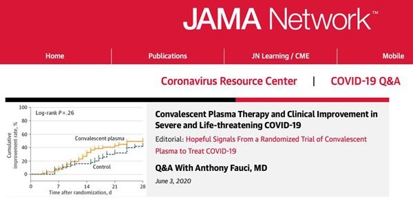 2020年6月3日,《美国医学会杂志》(Journal of the American Medical Association,JAMA)在线发表中国医学科学院输血研究所刘忠团队完成的题为“Effect of Convalescent Plasma Therapy on Time to Clinical Improvement in Patients With Severe and Life-threatening COVID-19”的研究论文,报道恢复期血浆对重症和危重症新冠肺炎的治疗效果。