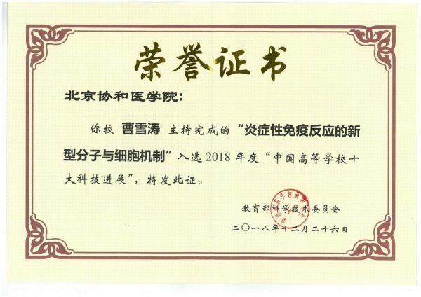 2018年度“中国高等学校十大科技进展”颁奖 曹雪涛院士主持的 “炎症性免疫反应的新型分子与细胞机制” 项目获奖