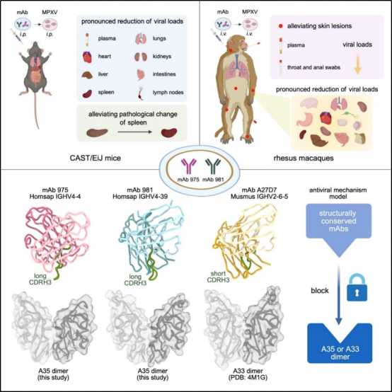 成果简介:猴痘疫情严重威胁了全球公共卫生安全,世界卫生组织曾两度宣布其为“国际关注的突发公共卫生事件”。猴痘病毒包膜粒子表面的A35蛋白是开发抗病毒药物和疫苗的理想靶标。尽管有研究表明靶向A35抗体具备保护潜力,但其在非人灵长类动物模型中的保护效果有待阐明。该研究利用可识别猴痘病毒A35蛋白人源单克隆抗体(mAb 975和mAb 981)。在猴痘病毒感染的CAST/EiJ小鼠模型中,单独使用任一抗体均能有效降低血浆及多组织中的病毒载量,显著缓解脾脏的病理损伤等。在猴痘病毒感染的非人灵长类动物模型中,这两株抗体同样具有显著的保护效果,不仅能降低恒河猴血浆、咽拭子、肛拭子和各组织中病毒载量,还可显著抑制皮损出痘等临床症状。此外,通过冷冻电子显微镜技术解析了mAb 975及mAb 981抗体分别与A35蛋白复合物的高分辨率三维结构,揭示了抗体识别猴痘病毒A35的结构基础。该研究不仅佐证了猴痘感染模型在猴痘抗体药物筛选中价值,也为下一代猴痘疫苗的开发和设计提供了有价值的参考。
