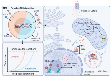 成果简介:琥珀酸在琥珀酸脱氢酶(SDH)突变的肿瘤中高度积累,并调控抗肿瘤免疫应答。尽管已有争议性研究报道琥珀酸可调节CD8⁺T细胞的细胞毒性,但其是否以及如何影响T细胞分化状态仍不明确。该研究揭示,SDHB缺陷型肿瘤中肿瘤特异性CD8⁺T细胞的数量增加,且对抗PD-L1疗法表现出良好应答。进一步研究发现,长期暴露于琥珀酸可促进CD8⁺T细胞的存活及干性维持能力。机制上,琥珀酸通过BNIP3介导的线粒体自噬改善线粒体功能,并诱导组蛋白甲基化景观重塑,导致与T细胞干性相关基因(尤其是Tcf7)表达增加。经琥珀酸扩增的CD8⁺T细胞在长期存续和抑制肿瘤生长方面展现出显著优势。值得注意的是,在黑色素瘤和胃癌接受免疫检查点阻断治疗的患者中,琥珀酸富集与良好临床结局呈正相关,这印证了琥珀酸积累在癌症免疫治疗中的临床意义。该研究揭示了琥珀酸具有维持T细胞“干细胞”样特性的新功能,证明补充琥珀酸可增强T细胞免疫疗法的疗效。
