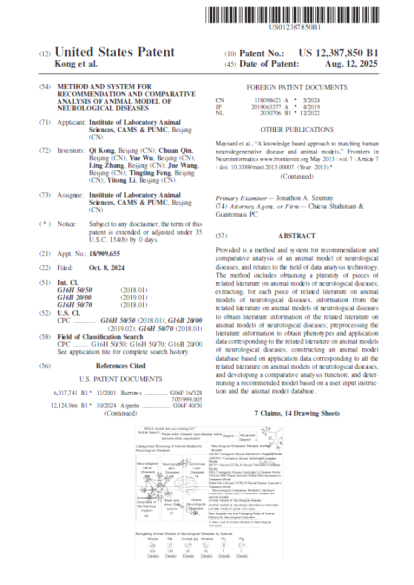 九、医学实验动物研究所开发神经系统疾病动物模型推荐、比较分析方法及数据库系统(美国专利US 12 387.850 B1)