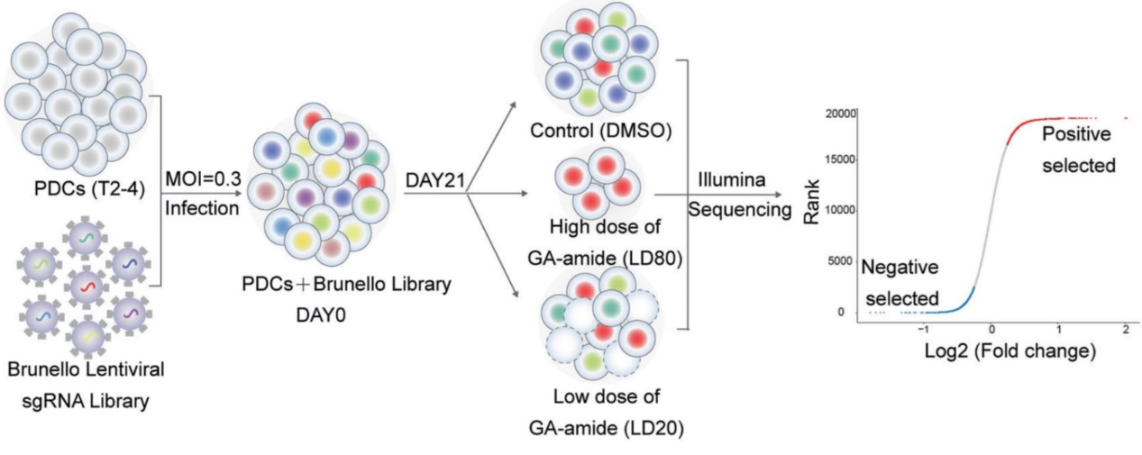 研究发现GA-amide穿透血脑屏障,在肿瘤区富集显著抑制神经胶质瘤生长。通过sgRNA慢病毒文库对GA-amide在患者来源的原代胶质瘤细胞(PDCs)中的功能靶基因进行全基因组范围的筛选和鉴定,最终证明了GA-amide与靶蛋白WDR1结合,促进WDR1、MYH9和Cofilin复合物形成,加速了F-肌动蛋白的解聚以减弱PDCs的侵袭能力,并通过线粒体途径诱导PDCs凋亡。该研究揭示了GA-amide在神经胶质瘤中的新靶点和调控细胞骨架稳态的信号转导机制,为胶质瘤的临床治疗提供了新的干预策略。(图1)
