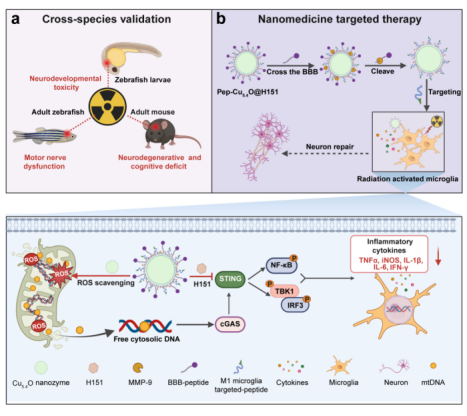 针对这一困境,团队首先明确建立“神经元损伤程度与认知行为障碍表型”的直接关联,为RIBI病理机制研究提供了清晰的研究框架。在此基础上,团队进一步深入分子机制层面,突破性揭示辐射诱发神经毒性的核心调控轴——“ROS-线粒体-免疫”轴的作用机制。团队进一步聚焦“机制导向的精准治疗”,设计并构建了新型纳米治疗平台Pep-Cu5.4O@H151。该平台通过模块化设计实现“多效协同”的精准纳米治疗。研究结果表明,该纳米平台可同步实现“外源性抗氧化应激+内源性抗炎”的协同治疗效果,显著改善RIBI模型动物的神经功能与认知障碍,展现出极高的临床转化潜力。