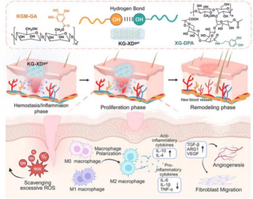 成果简介:创面修复受炎症和氧化应激等多重因素影响,现有治疗难以同时兼顾氧化损伤与免疫调控。研究提出通过生物材料实现“抗氧化+免疫调控”双重机制促进血管生成和组织修复的设想。为此,研究团队构建了一种天然来源的多功能材料KG-XDgel,将没食子酸和多巴胺的抗氧化特性与多糖基质的免疫调控功能相结合,形成兼具结构稳定性、组织黏附性和自愈性能的平台。研究表明,该材料能够高效清除活性氧,缓解氧化应激导致的细胞损伤;同时诱导巨噬细胞向M2型极化,下调TNF-α、IL-6等促炎因子,提升IL-10、TGF-β等修复因子,从而改善炎症环境并显著加速了创面的愈合进程,在血管生成和基质重塑方面展现出突出优势。该天然水凝胶无需外源因子,一步整合抗氧化防御与先天免疫重编程,显示了在组织修复中的应用潜力,为难愈性伤口提供了一种无药物、低风险、具临床转化前景的创新方案。