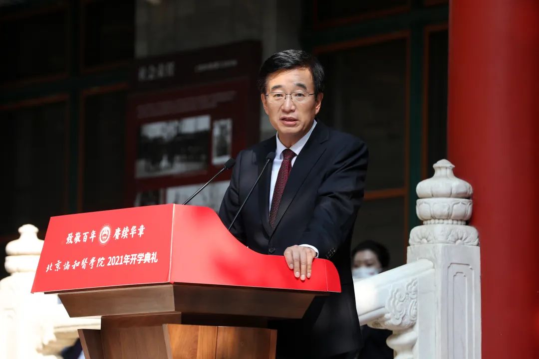 中国医学科学院院长、学术咨询委员会学部委员,北京协和医学院校长王辰院士发表讲话。他说,人生有一种重要的经历叫求学;求学有一个门类叫学医,医学盈溢着爱,是堪与厮守终生的学问、职业、使命;学医有一个地方叫协和,协和与中国医学科学院院校一体,打造国家医学科技创新体系的核心基地;协和有其盛名,协和有其突出的优势,协和更有其需要改进和发展之处,不但协和,你们将来工作的每一个地方都会如此,你们要成为善化体系的促动力量;学习的历程中,有一个概念叫作“级”,另一个概念叫作“届”,这“级”和“届”之间就是你们在校学习的时光。你们是2021级新生已为现实,某某届毕业生还只是预期,希望你们努力,求学业圆满,得化茧成蝶。