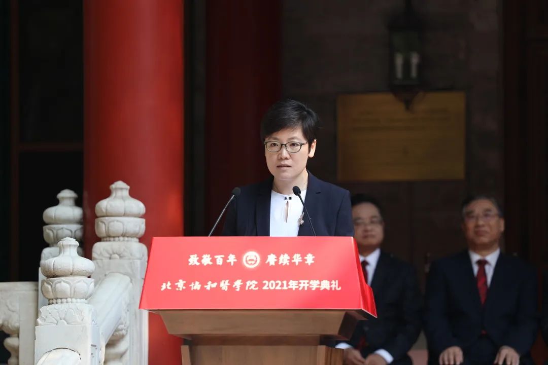 新生代表2021级直博生袁硕发言,号召全体新生作为协和精神的传承人,将个人医学梦融入到国家医学发展的大潮中去,以“除人类之病痛,助健康之完美”为己任,为社会医药卫生事业的发展和人类身心健康奋斗终身,不负祖国和人民的殷切期望。