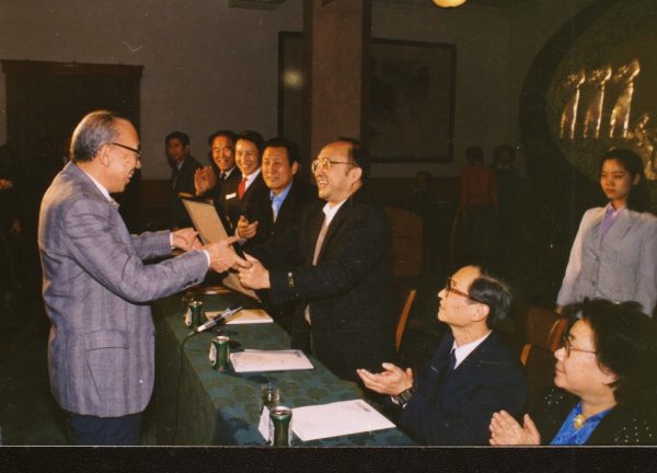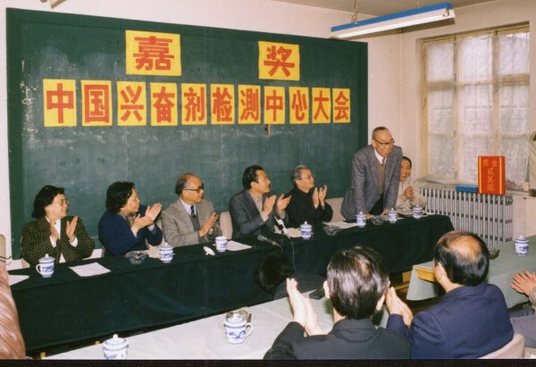 1990年,国家体委主任伍绍祖隆重颁发奥委会授予的中国兴奋剂检测中心证书(左一:周同惠)