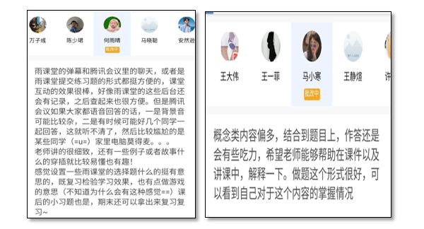 作为伴随“互联网”成长起来的一代,同学们习惯并喜欢隔着屏幕表达自己的观点。在传统面授课堂中,碍于面子,很多同学不擅于表达自己的看法。社区护理学系教师们尊重同学们的交流习惯和喜好,选择“雨课堂”的弹幕功能作为师生课堂沟通的主要方式,打破了传统课堂中的“一片寂静”。“发表弹幕不会透露姓名”,一旦遇到不懂的地方就可以直接提出,无需顾忌面子问题,并可得到老师的及时反馈,少了“害羞”,师生交流更加自由、自然,“也避免了老师课上提问无人回答的尴尬场面”,活跃了上课氛围,“互动增多后走神的情况也有所好转,整堂课下来,效果不输传统课堂”。