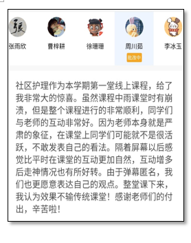 从三周的线上授课反馈情况看,同学们对《社区护理学》线上课堂氛围、互动形式、教学内容设置给予了正向评价和中肯建议。