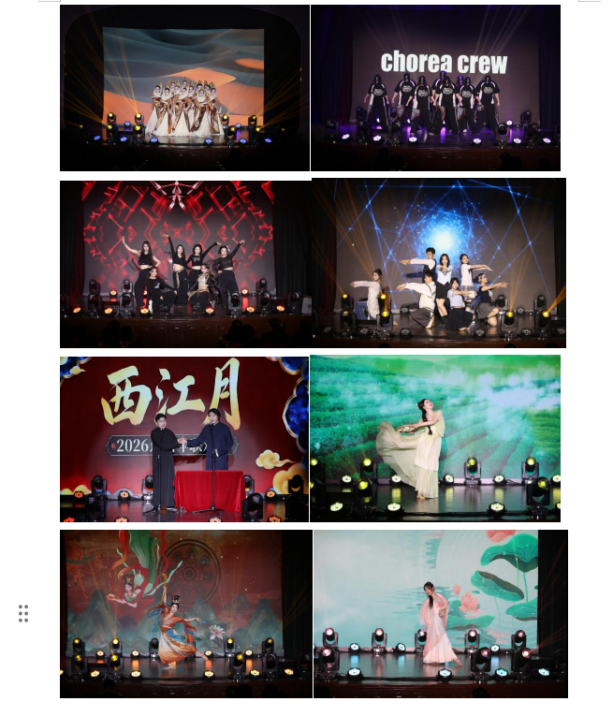 由离退休教职工组成的“协和音”合唱团以悠扬恢弘的《壮美延安》与欢快灵动的《新年好》惊艳开场。婉转旋律承载信仰之力,轻快节奏传递新春喜悦,为联欢会正式拉开序幕。博雅合唱团倾情演绎《瑶山夜歌》《天耀中华》,抒发新时代中华儿女的家国豪情与民族自信。校舞蹈队的《大漠沙海》和舞蹈串烧《茶花开了》《苏公堤》《念琵琶》唯美登场,裙裾轻扬间,东方美学的浪漫与韵味尽显,意境悠远,引人沉醉。相声《西江月》创意十足,用幽默的对白与生动的演绎,将对科研人的祝福送进协和人的心中。歌曲《Love in the dark》《乌兰巴托的夜》《海芋恋》,将青春热忱与纯粹美好尽情传递。飞扬舞蹈团的《奔跑的青春》、NINEVER女团的《What is Love》、Chroea Crew街舞社的《Hands Up》与《Swag it Out》,以及舞蹈串烧《You and me》《Girl boss》《Talk that talk》点燃全场,以饱满热烈的青春姿态展现协和青年学子的蓬勃朝气与无限活力。院校老师们带来的歌舞乐器表演《不忘初心》《疯狂动物城》,又以多元形式诠释为医为师的赤诚初心。老师和同学们以饱满热忱登台献艺,用精湛表演致敬过往时光,更将青春的憧憬与对未来的希冀娓娓诉说。