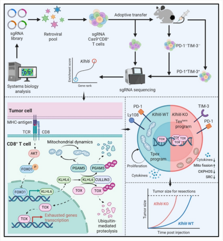 进一步机制解析发现,TOX和PGAM5是KLHL6的直接作用底物。在慢性感染或肿瘤微环境中,持续性TCR信号刺激引起KLHL6表达持续下调,进而削弱对TOX的泛素化降解,促使TOX蛋白积累,加速T细胞耗竭程序的启动及向终末表型分化。同时,KLHL6表达下调还会通过PGAM5-Drp1信号轴诱导线粒体过度分裂和呼吸功能损伤,进一步加剧T细胞耗竭程度(见图)。