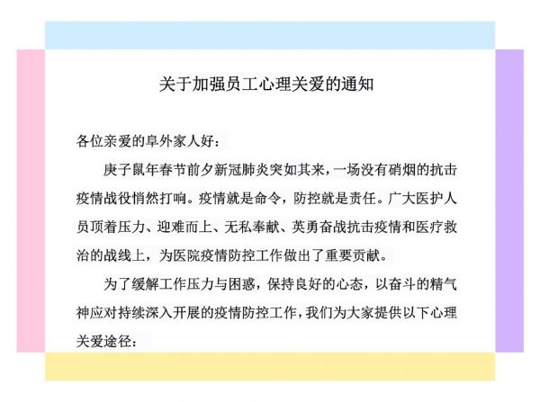 为了缓解工作压力与困惑,保持良好的心态,以奋斗的精气神应对持续深入开展的疫情防控工作,医院工会、医务处、护理部共同协调开通了相关职工心理关爱途径,包括:北京市总工会心理援助热线、北京林业大学线上心理援助服务、新型冠状病毒肺炎疫情中各类人员心理防护协和实用手册等。这些心理援助包含专业心理咨询师热线电话、微信在线咨询、线上语音沟通的心理支持以及可以下载浏览的新冠病毒防护知识手册。如职工及身边的家属在工作和生活中出现心理焦虑、恐惧、忧郁、烦闷等问题,可随时通过相关服务寻求帮助,有效缓解压力,消除消极认知,稳定情绪,保持健康的生活方式,以积极向上的心态应对疫情。医院工会将为全院职工的身心健康保驾护航,守护大家心灵上的平实和轻松。