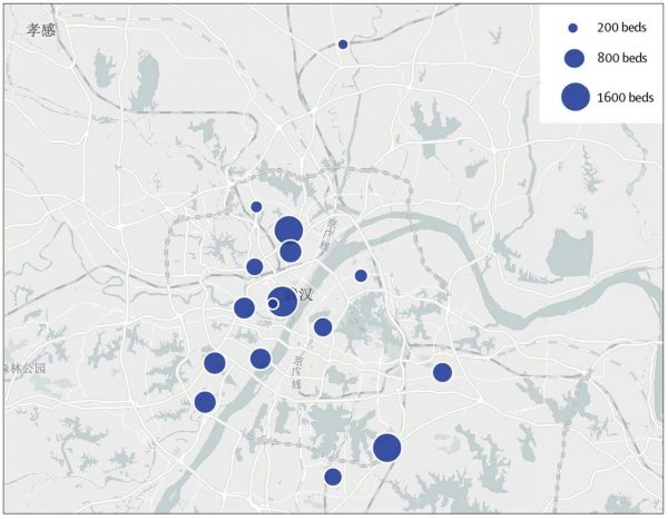 图4: 中国武汉市暴发新冠肺炎疫情期间,方舱庇护医院的位置和容量(圆的大小与相应方舱庇护医院的病床数量成正比)