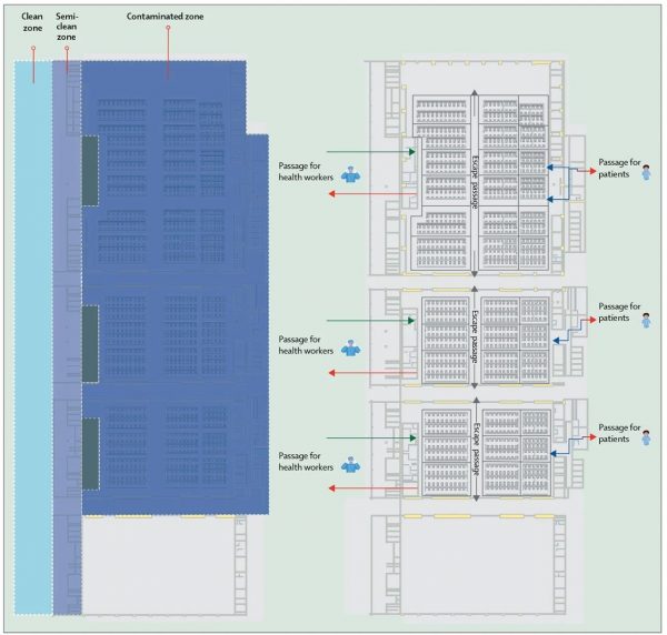 图2:中国武汉一家由会展中心改建的方舱庇护医院的区域和通道设置