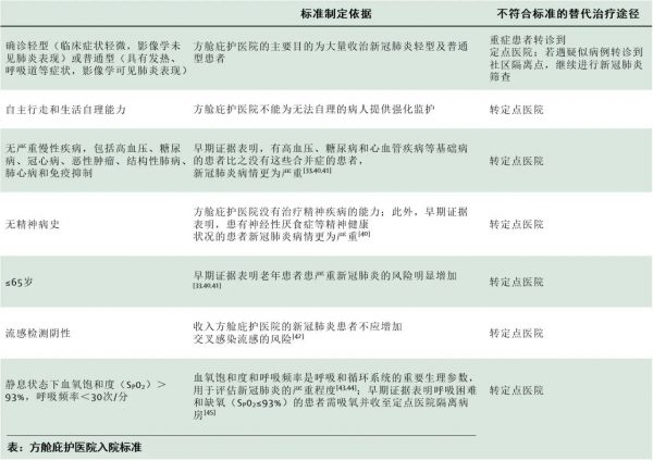 第二个主要功能是分诊。方舱庇护医院为中国的医疗卫生体系增加了一个额外的医疗照护层级,为应对新冠肺炎疫情提供了一个具有战略性的分诊策略。符合入院标准(见下表)[6,46]的轻型和普通型新冠肺炎患者在方舱庇护医院接受隔离和治疗,而重症和危重症患者则在定点医院接受治疗。这种战略性分诊功能释放了定点医院的压力,从而提高了中国应对新冠肺炎疫情的效率和效力。方舱庇护医院使武汉市医疗卫生系统得以将重症和危重症患者(约占新冠肺炎患者的20%)安排在定点医院进行治疗,同时确保能为轻型和普通型患者(约占新冠肺炎患者的80%)提供适宜的医疗照护[16,33]。