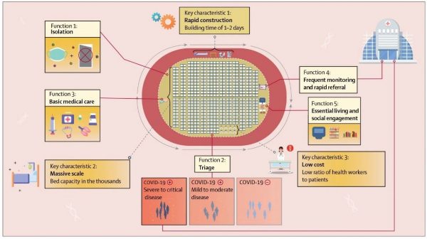 《柳叶刀》(The Lancet)于4月2日发表由中国医学科学院王辰院士及海德堡大学医学院Till Bärnighausen教授领衔的关于方舱庇护医院(Fangcang shelter hospitals)的卫生政策文章。本文描述了武汉市发生COVID-19期间方舱庇护医院的构建与应用情况,并阐明其三个主要特点(建设快、规模大、成本低)和五个主要功能(隔离、分诊、基本医疗、密切监测和快速转诊、基本生活和社会活动)。方舱庇护医院将成为国家应对COVID-19以及未来感染病和突发公共卫生事件的一项有力举措。