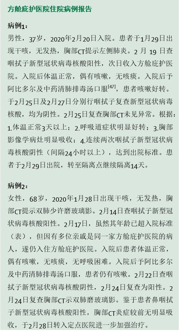 第三个主要功能是提供基本医疗照护,包括可提供抗病毒药、退烧药和抗生素药物,氧气吸入以及心理健康咨询[6]。文中彩框展示了两个病例报告,显示了在方舱庇护医院住院期间的典型病史。为了支持医疗,在第一家方舱庇护医院启用几天后,武汉的医护人员就能够使用由云平台支持的电子信息系统,并与定点医院进行连通,用于保存记录病例、数据传输,以及对医疗质量和结果的监控[46]。