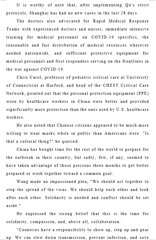 即使在此次疫情早期,重灾区还基本限于中国时,美国的胸科医师协会很早就给中国同行发出可以说是热情洋溢的慰问信,并表示会随时提供后援。当时谁曾预料仅仅一月以后供需情况就会反转呢?
