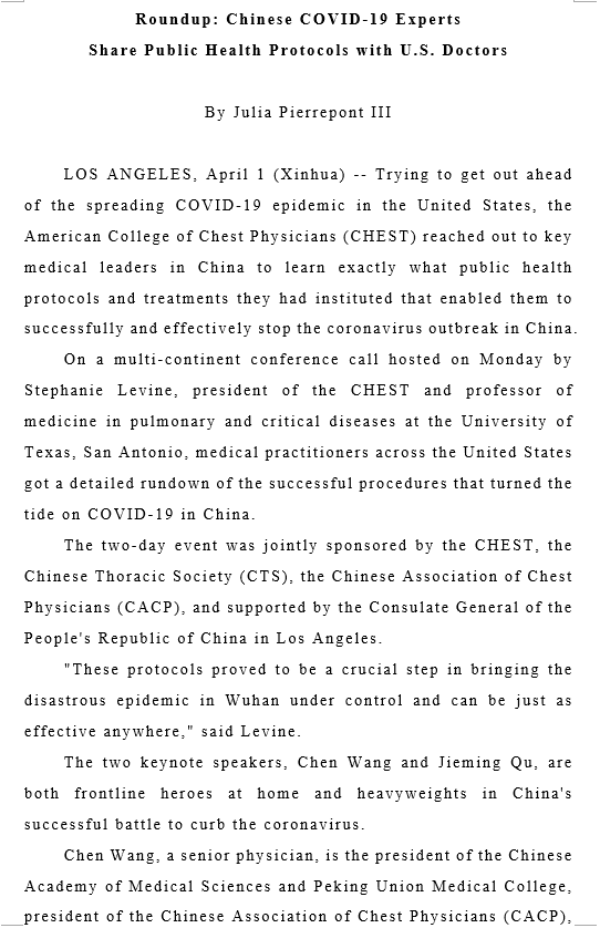 编者的话 3月30日,美国胸腔医师学会(CHEST)、中国呼吸学会、中国呼吸医师协会和中国驻洛杉矶总领事馆共同举办了2场“中美携手抗击新冠:中国高级别专家向美国同行分享最前线经验”网络研讨会,研讨会由美国胸腔医师学会主席StephanieLevine教授主持,中国医学科学院院长王辰院士、上海瑞金医院院长瞿介明、中日友好医院副院长曹彬、中日友好医院呼吸与危重症医学科主任詹庆元等中国顶尖专家向美国医护人员分享了中国抗击新冠肺炎的成功经验,引起中美两国医学界和媒体广泛关注。