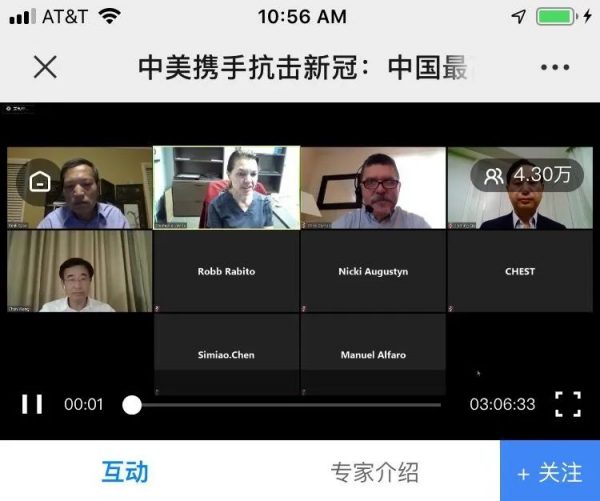 国内派出了医疗界最权威的四位讲者,包括中国医学科学院院长王辰教授,上海瑞金医院的瞿介明教授,中日友好医院的曹彬和詹庆元教授。这几位都是有关专业学会的主要负责人,而且都是带着在武汉前线亲临一线的几个月的实战经验,美国这边也是学会主席与董事长亲自主持坐镇。不仅如此,中华人民共和国驻洛杉矶的总领事张平大使也亲自致辞。