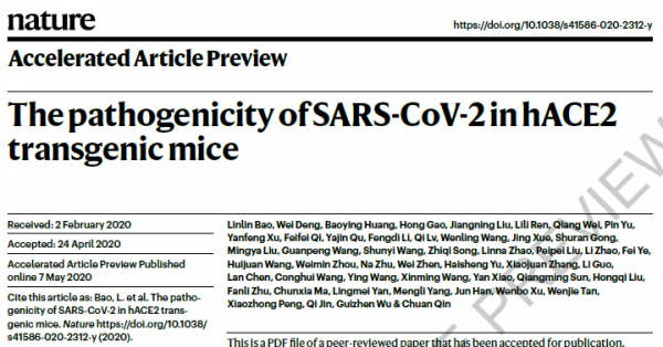 2020年5月7日,中国医学科学院医学实验动物研究所秦川团队联合来自于中国疾病预防控制中心病毒病预防控制所、中国医学科学院病原生物学研究所、中国医学科学院医学生物学研究所的团队,在Nature上正式发表了研究论文:“The Pathogenicity of SARS-CoV-2 in hACE2 Transgenic Mice”。