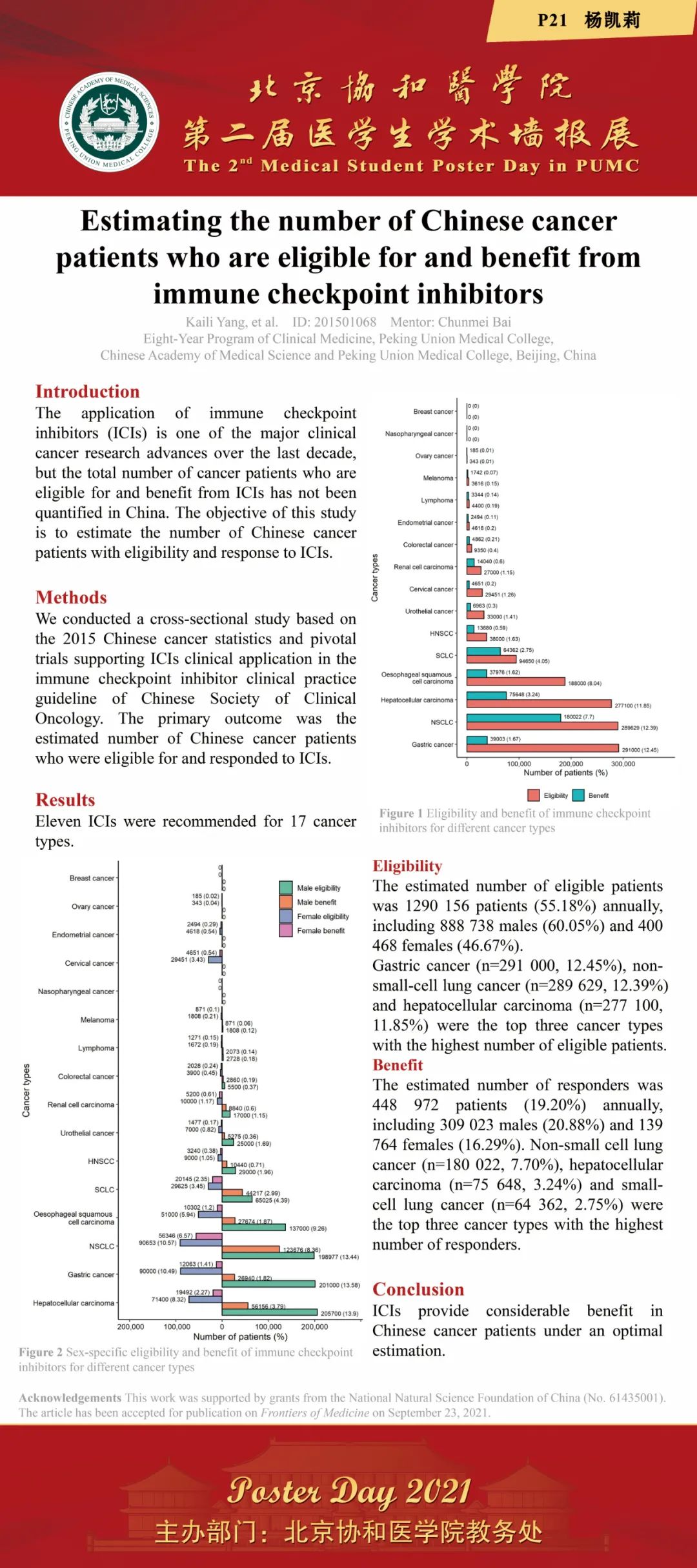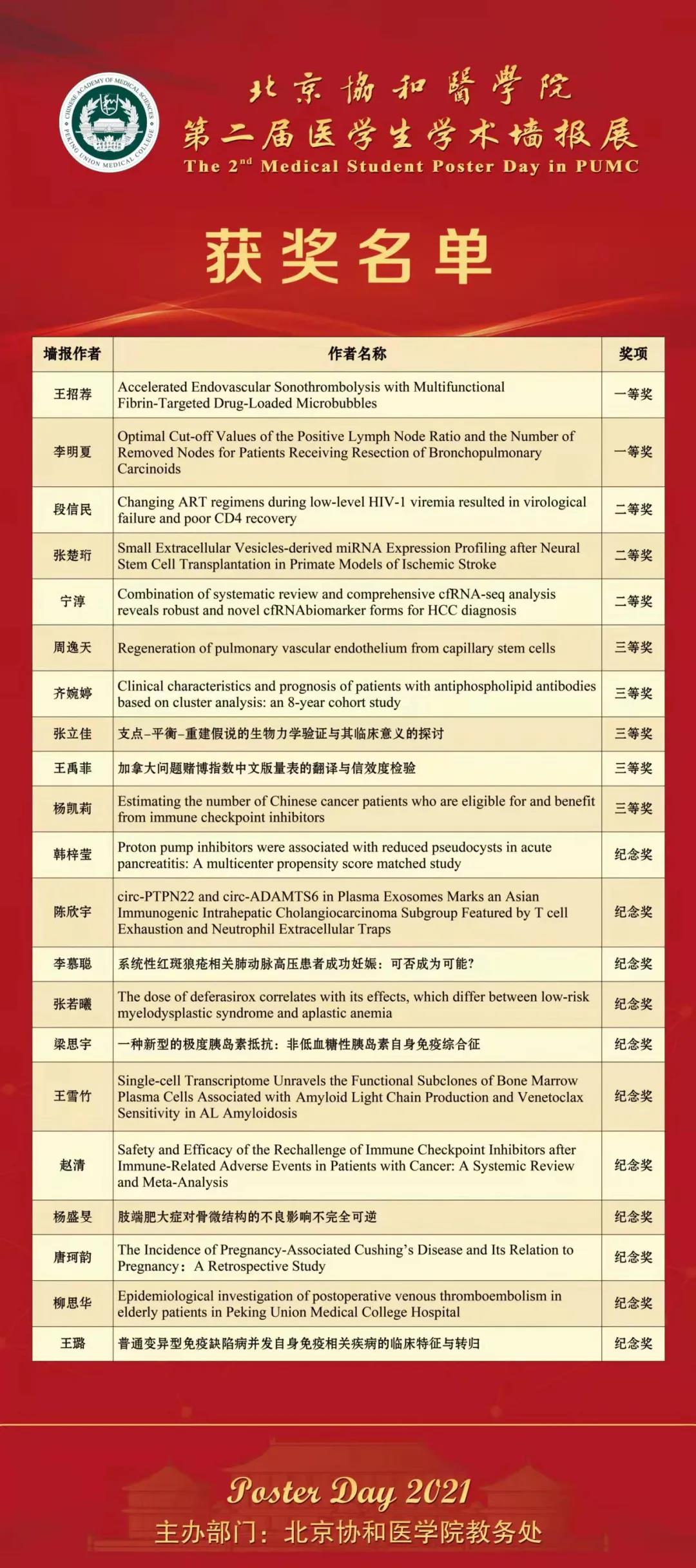 2021年12月3日,由教务处举办的“北京协和医学院2021年第二届医学生学术墙报展”在吴宪大楼一层大厅进行了墙报交流和评选活动。经过专家和学生共同评选,评出一等奖2项,二等奖3项,三等奖5项和纪念奖11项。