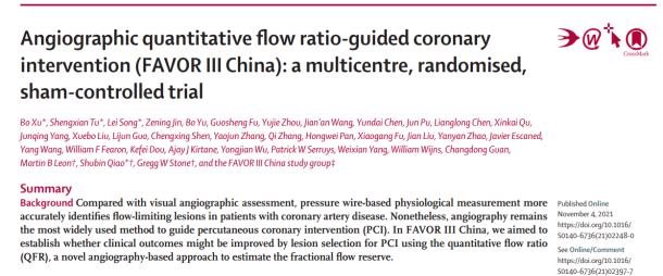 FAVOR III China研究是由国家心血管病中心、中国医学科学院阜外医院发起,由北京市科委、国家心血管疾病临床医学研究中心及中国医学科学院资助,全国26家中心共同参与的大规模、对受试者和临床评价者设盲、随机、“假”对照临床试验。我院徐波教授、乔树宾教授、宋雷教授为本文共同第一作者,乔树宾教授为高级作者,徐波教授为本文通讯作者。文章发表于顶级医学期刊《柳叶刀》(The Lancet,影响因子79.3)。FAVOR III China研究通过科学严谨的试验设计和高水平的质控管理,证明QFR指导的冠心病介入治疗可显著改善患者临床预后,在合理控制医疗费用的前提下给冠心病患者带来切实获益。文章在国际顶级医学期刊发表也标志着中国原创的心血管诊疗新技术和高质量临床研究已达到新的水平,有能力深度参与国际医学竞争,用中国方案贡献全球证据、解决世界问题。