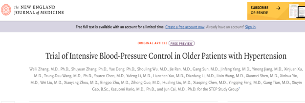 2021年8月30日《新英格兰医学杂志》刊发了我院高血压中心蔡军教授牵头发起的中国老年高血压患者降压靶目标的干预策略研究(STEP研究)。我院蔡军教授和张伟丽教授是共同通讯作者。同期,该研究在2021年ESC大会Hot line环节汇报展示。STEP研究是对老年高血压患者最佳降压靶目标的进一步探究,其研究成果为今后高血压临床管理规范、国内外指南修订、公共卫生政策提供了重要的证据和支持。