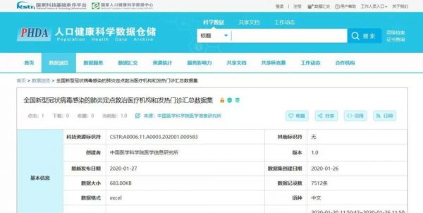 国家人口健康科学数据中心 发布全国新型冠状病毒感染的肺炎定点救治医疗机构 和发热门诊汇总数据集