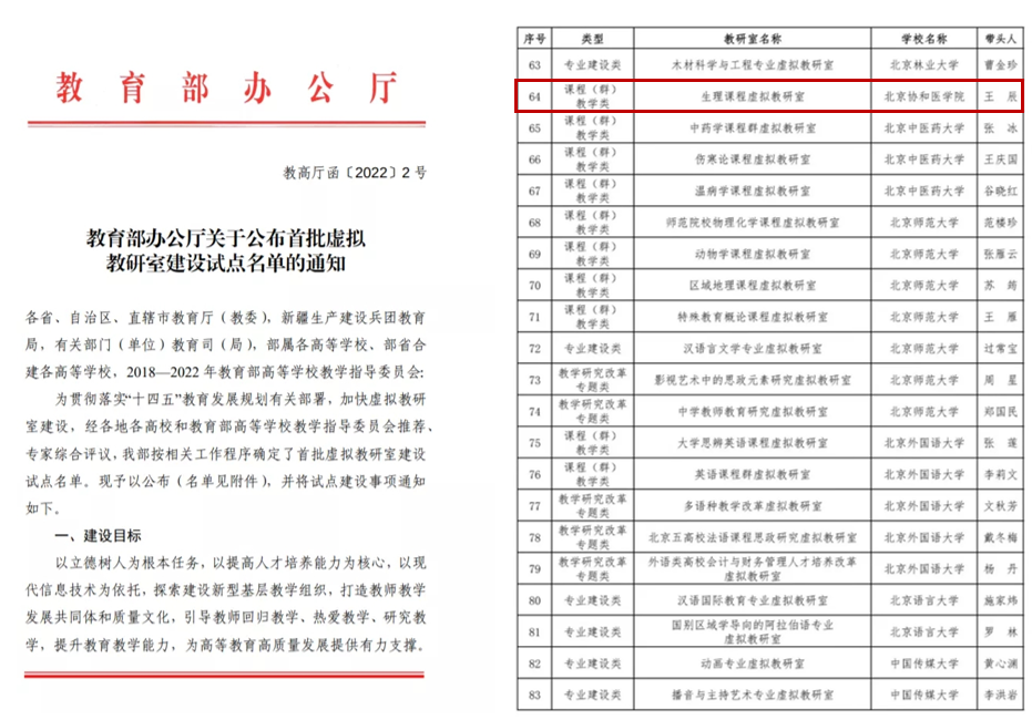 喜报:协和医学院生理课程虚拟教研室入选教育部首批虚拟教研室建设试点名单