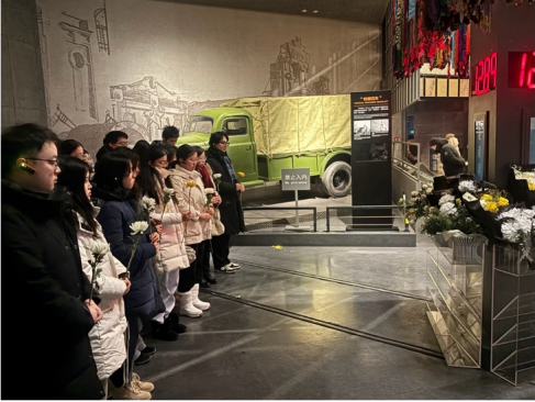 参观行至尾厅,气氛愈发凝重。全体师生有序列队,向遇难同胞敬献鲜花,低头默哀。白菊寄哀思,静默寄深情。这一刻,这份庄重的仪式感让铭记历史、敬畏生命的信念在每个人心中扎根。