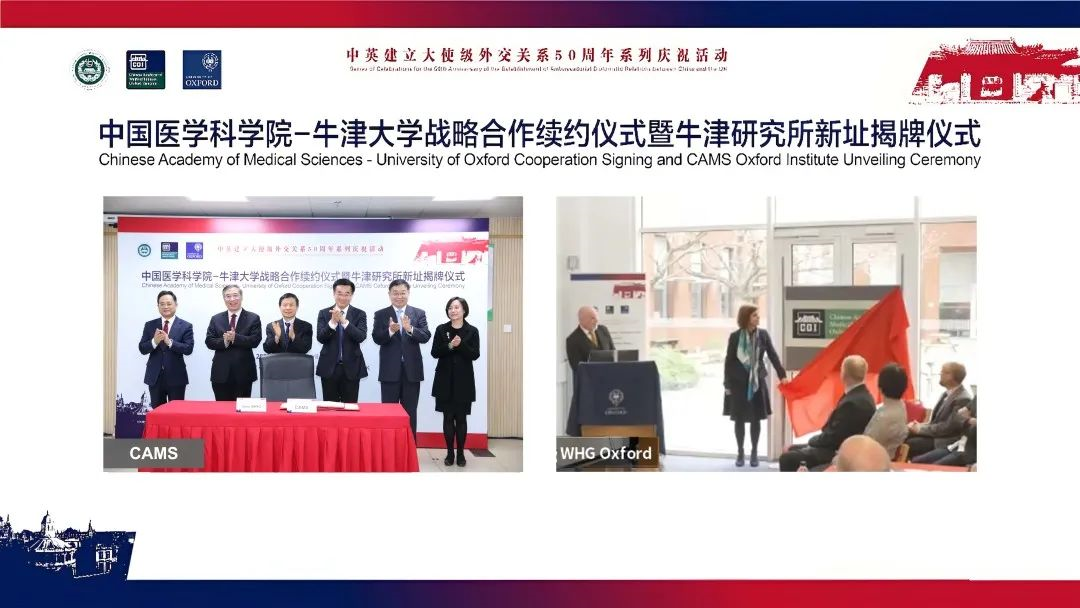 2022年4月28日,中国医学科学院与牛津大学在线举办了第二期合作签约仪式暨中国医学科学院牛津研究所(以下简称“牛津研究所”)新址揭牌仪式。中国医学科学院院长王辰院士和院领导李青、王云峰、张勤、王健伟,牛津大学校长路易斯·理查德森(Louise Richardson)、纳菲尔德医学部主任理查德·康奈尔(Richard Cornall) 和执行主任戴伦·纳什(Darren Nash),国家留学基金管理委员会秘书长生建学,中国驻英国大使馆科技公参蒋苏南,牛津研究所中方所长曹雪涛院士、英方所长董涛教授及刘德培院士、饶子和院士等中英方科学家50余人出席了此次活动。