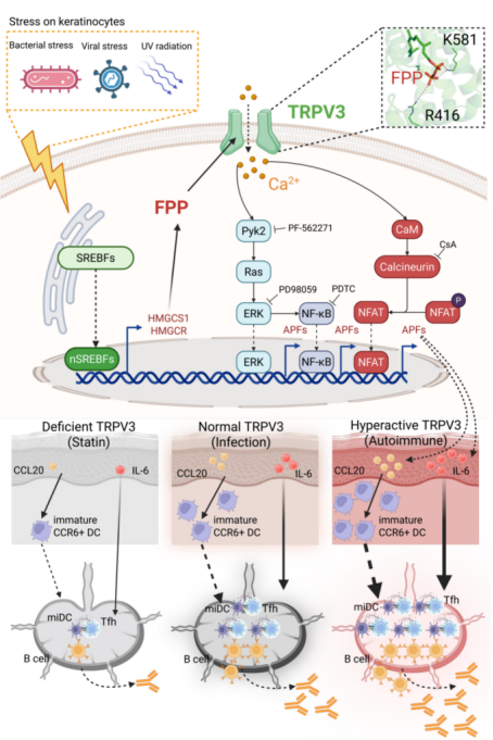 团队首次发现皮肤最外层的角质形成细胞不仅仅是物理屏障,更像是机体的哨兵,当它们感知到感染或刺激时,会释放出一种名为法尼基焦磷酸(FPP)的代谢中间产物,这种物质扮演着“内源性免疫警报素”的关键角色,它通过激活皮肤上的特殊“开关”——TRPV3通道,促使局部释放IL-6和CCL20等信号分子,最终在淋巴结中启动强大的生发中心反应,训练出能精准打击病原体的高亲和力抗体,从而清晰描绘出从皮肤局部信号到全身体液免疫的完整分子通路。