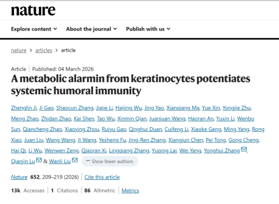 2026年3月4日,中国医学科学院皮肤病医院(皮肤病研究所)陆前进教授与清华大学刘万里教授团队、中南大学湘雅二医院吴海竞教授团队、清华大学药学院张永辉教授团队等合作在国际顶级期刊《Nature》发表题为《A metabolic alarmin from keratinocytes potentiates systemic humoral immunity》的研究论文。