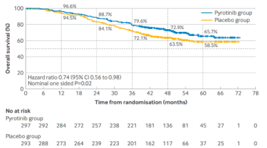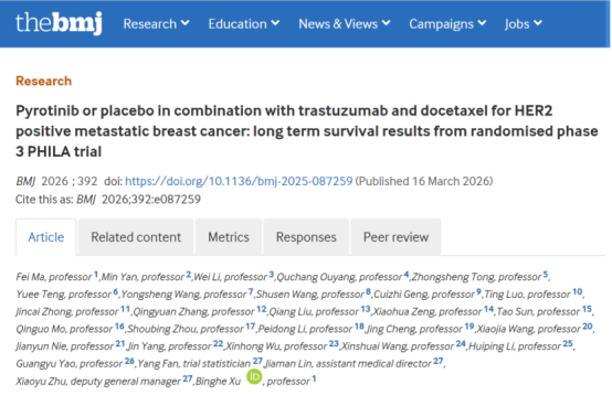 2026年3月16日,中国医学科学院肿瘤医院徐兵河院士团队在《英国医学杂志》(BMJ)在线发表了题为“Pyrotinib or placebo in combination with trastuzumab and docetaxel for HER2 positive metastatic breast cancer: long term survival results from randomised phase 3 PHILA trial”的研究成果。