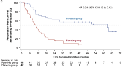 PHILA研究是一项由中国医学科学院肿瘤医院徐兵河院士牵头,基于中国原研药物开展的一项随机、双盲、多中心、Ⅲ期临床试验。该研究采用不可逆的HER2受体酪氨酸激酶抑制剂(TKI)吡咯替尼,联合曲妥珠单抗,通过大小分子协同机制双重抑制HER2信号通路,旨在比较PyroHT方案与曲妥珠单抗联合多西他赛(HT)方案一线治疗HER2阳性晚期乳腺癌的疗效与安全性。作为首个发表于BMJ的中国乳腺癌药物研究,PHILA研究于2023年首次发表,证实了PyroHT方案在无进展生存期(PFS)的显著获益和良好的耐受性,率先突破了国际学术界对中国乳腺癌原研研究的认知壁垒。