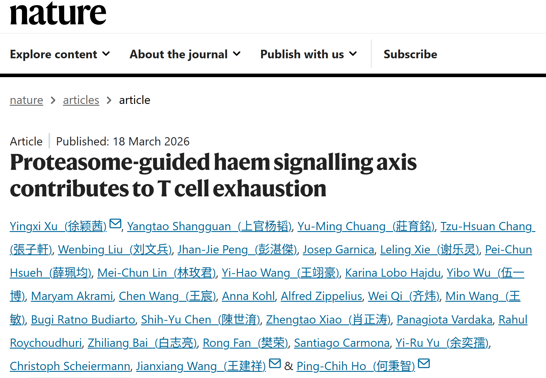 Nature | 血液病医院王建祥/徐颖茜与瑞士洛桑大学Ping-Chih Ho团队揭示血红素诱导T细胞耗竭新机制